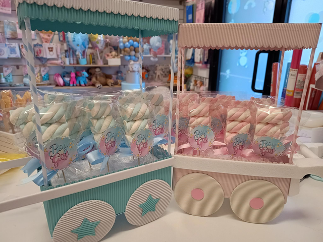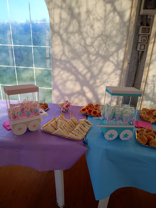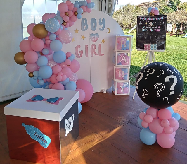 Scenario con ghirlanda di palloncini, scatola, mongolfiera nera, giochino rivelazione del sesso, palloncini vari, piattini, bicchieri, tovaglioli, regalini fine festa